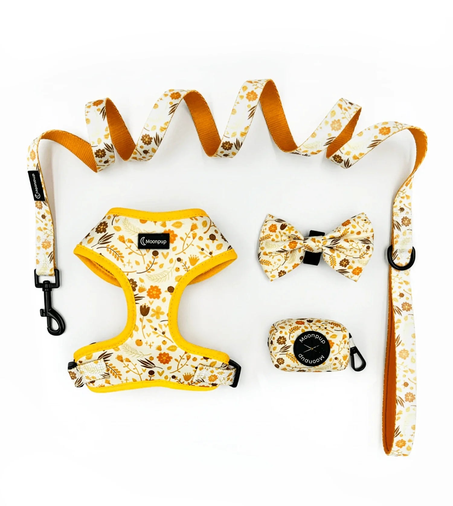 Modelul accesoriilor din colectia ”Flori Oranj” cuprinde elementele specifice naturii in nuante de galben si oranj pe un fundal alb. Marginile colorate vor face ca animalul tau sa atraga toate privirile, indiferent de culoare blanitei lui.